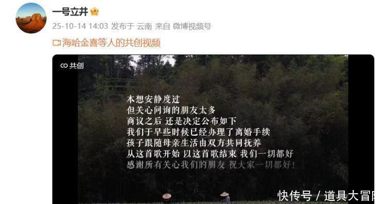 官宣离婚其实,这次分手早就埋下了伏笔。今年五月份,海哈金喜在视频里把离婚传闻给澄清了。她说,两人好长时间没见面,是因为李亚鹏得上山下山去采茶叶,她自己工作室也挺忙的。