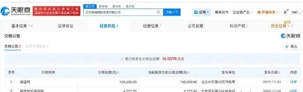 风波在2025年11月24日,国家税务总局北京市石景山区税务局发布了一份欠税公告,这份公告在密密麻麻的企业名单中,有一个名字格外显眼:北京英瑞国际贸易有限公司。