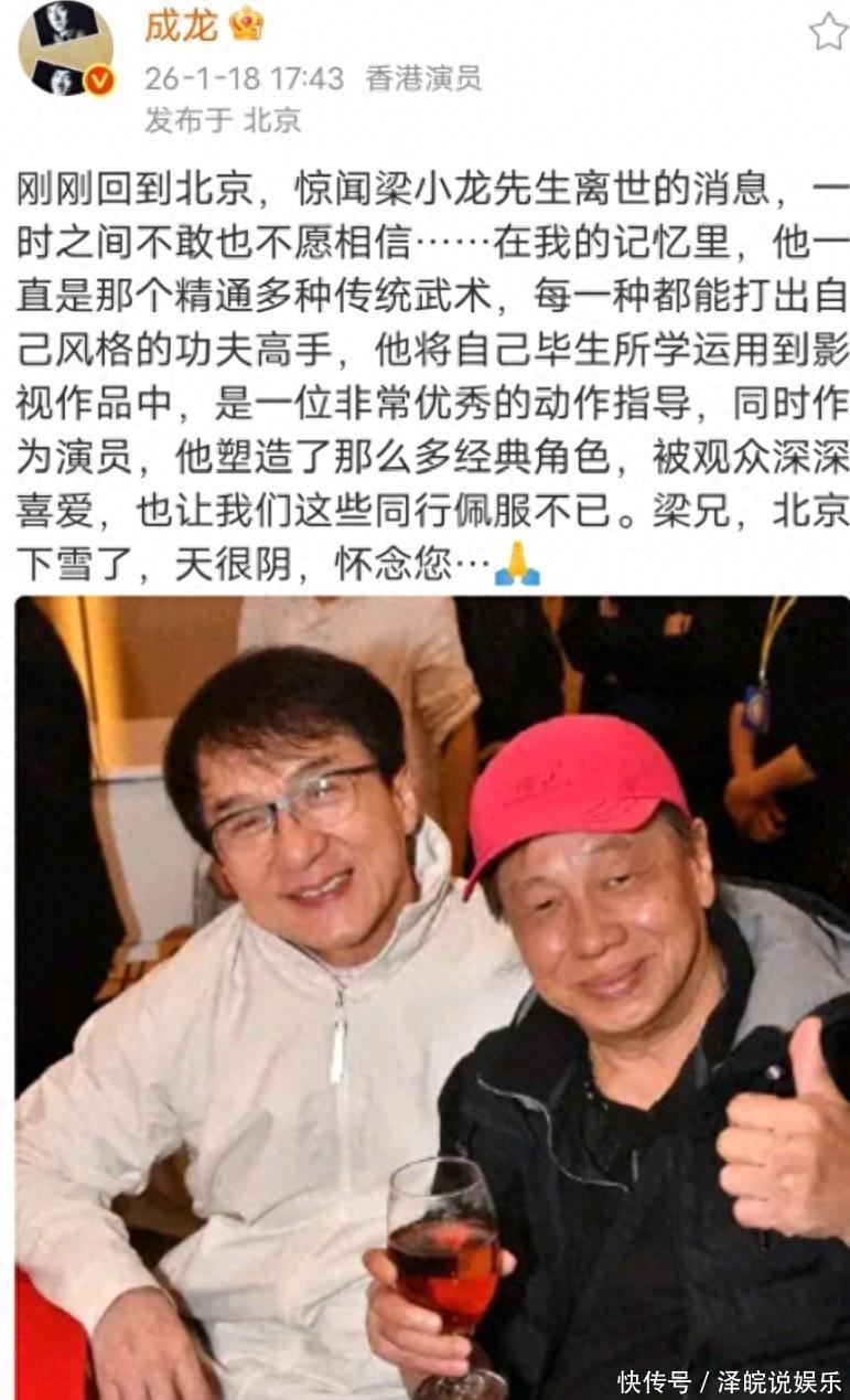 说实话,这两年成龙的日子不好过。家里那本难念的经,父子间的隔阂,让他那个“大哥”的光环暗淡了不少。可当他对着梁小龙的死讯低下头时,评论区里那些嘲讽的声音突然停了。为什么?因为大家突然意识到,那个真刀真枪、拳拳到肉的香港动作片时代,随着梁小龙的离去,那点余温也快散尽了。“回看这俩人的交集,其实藏着不少不为人知的暖。48年前拍《飞渡卷云山》,成龙拍戏时从高处摔下来崴了脚,梁小龙二话不说背起他就往医院跑,一路踩着泥泞走了两公里,后来还把自己珍藏的跌打药酒塞给他:‘习武的,身子是本钱,别硬扛’。 后来梁小龙被封杀,圈子里没人敢跟他来往,成龙却偷偷托人送过一笔钱,附了张纸条:‘梁兄,骨气不能丢,日子也得扛住’。那时候成龙刚崭露头角,这份情分,梁小龙记了一辈子。再后来两人重逢,梁小龙笑着拍他的肩膀:‘当年没白疼你这小子’,成龙没说话,只是把酒杯递过去,碰杯的瞬间,尽是江湖儿女的默契。”那时候两人都年轻,一身的腱子肉,眼神里全是想赢的野心。成龙后来回忆说,梁小龙的腿快到让他眼花。那不是商业互吹,是那时候的武行,没点真本事,连饭碗都端不稳。