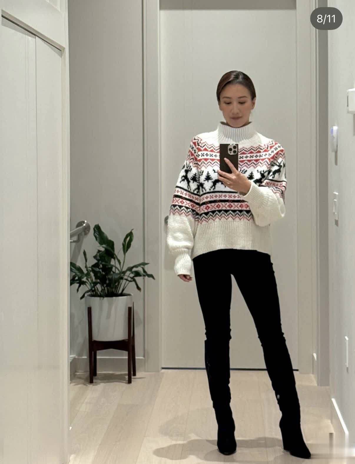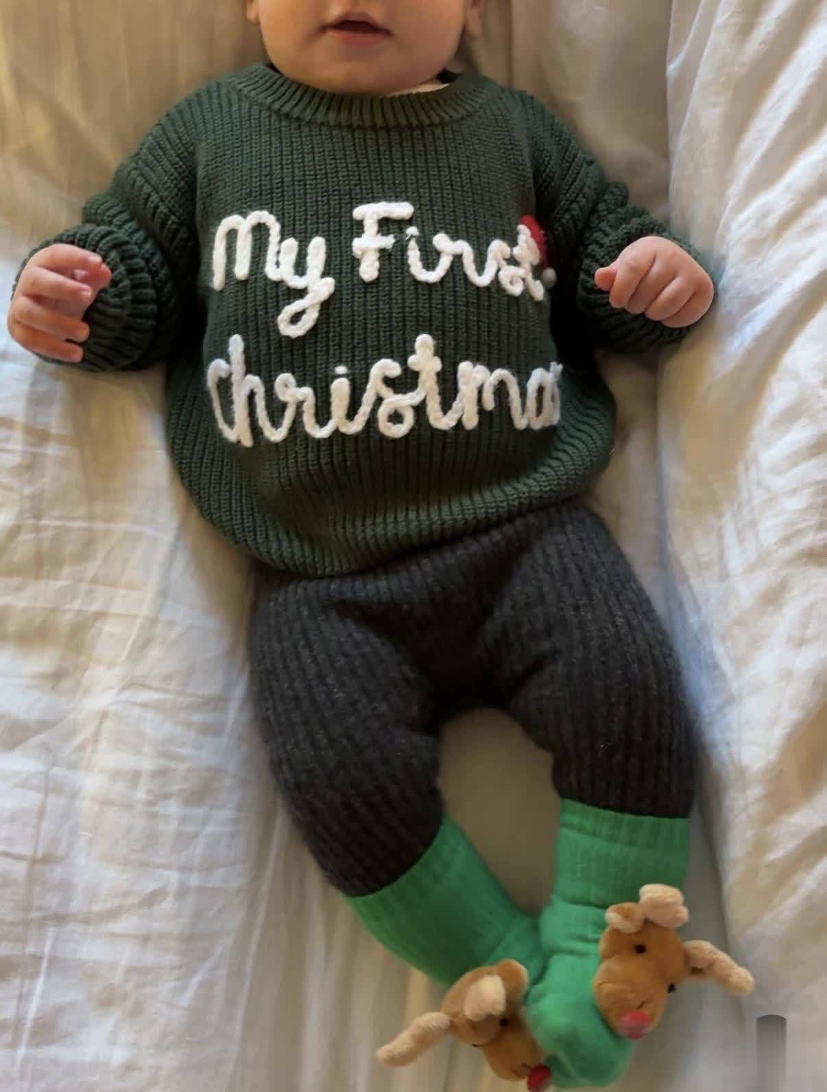 除了给家里装点,谢婷婷也在圣诞节平安夜给子女“装点”了一番,她给女儿Sara穿了一件墨绿色的毛衣,上面有雪花、小熊的图案,应时应景。而给儿子穿上了麋鹿的袜子,袜子很可爱,颜色是绿色的,上面有麋鹿的头,而在身上还穿了一件绿色的毛衣,上面有“My First Christmasa”的立体字样,显然这件衣服就是专属为儿子定制的。